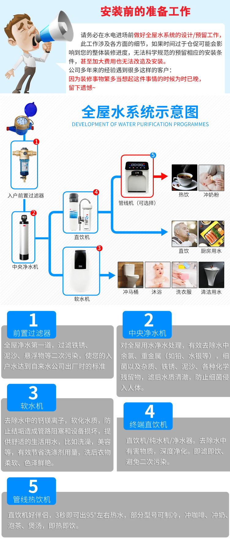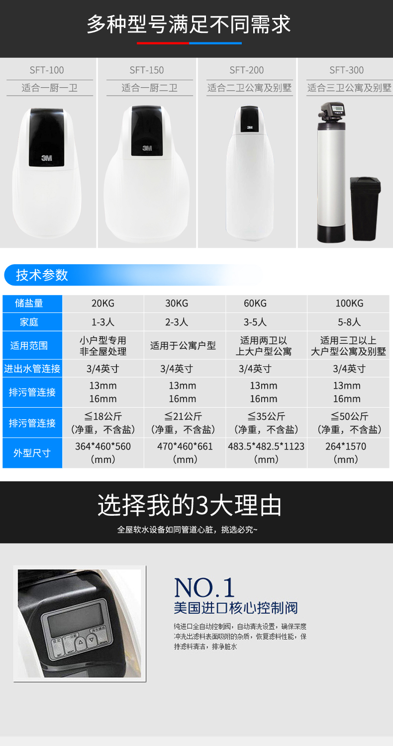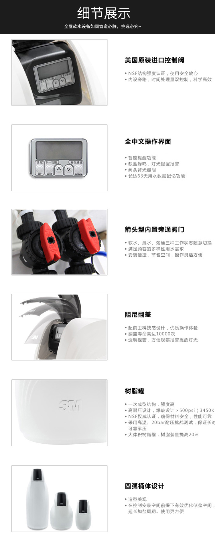 ● 美國原裝控制閥門,智能提醒功能,長時間運行可靠,免維護,全中文操作界面更方便,缺鹽蜂鳴,燈光提醒報警